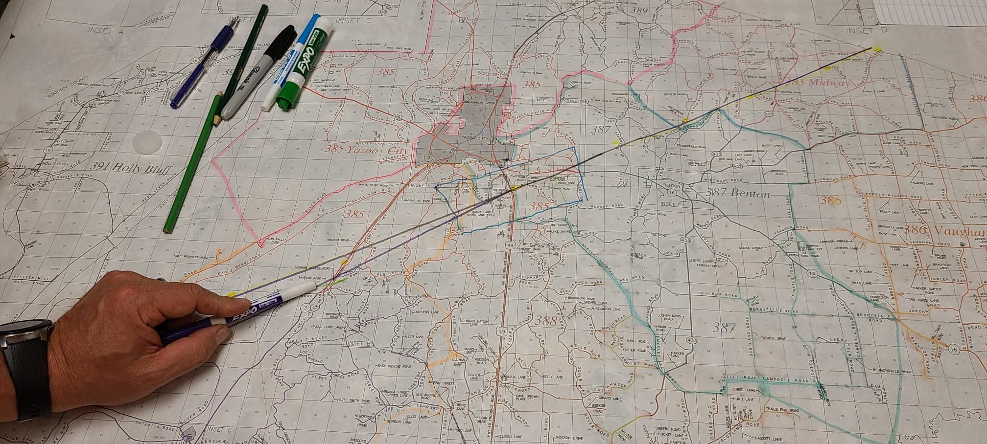 The map used by emergency management to plot visible damage and the probable path of the Yazoo tornado. (photo by David Day)